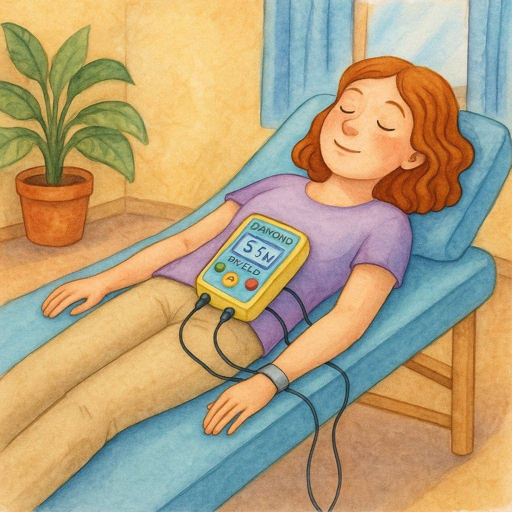 Du sitzt oder liegst während der gesamten Zeit vollkommen entspannt in meiner Praxis. Die Elektroden werden unkompliziert an den Hand- oder Fußgelenken befestigt – je nach Programm auch in Kombination.